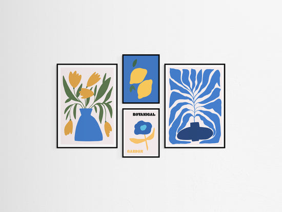 Botanical Garden is a 4-piece art wall kit full of playful plant life. With stylised florals, sunny yellows and bold blues, it brings a cheerful, contemporary twist on nature to your walls.