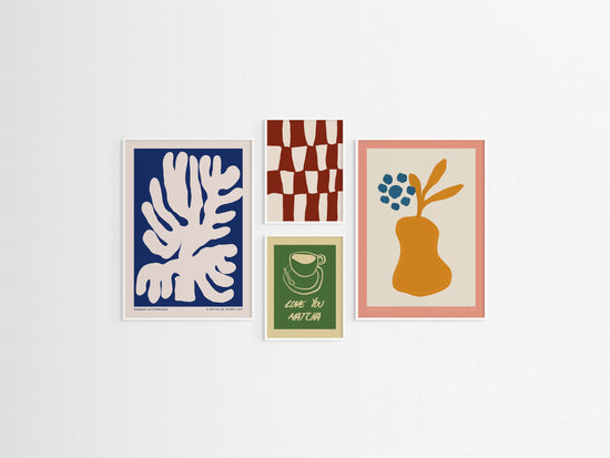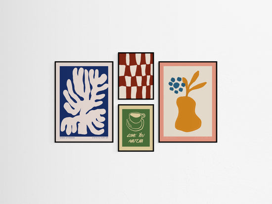 Sunday Afternoon is a 4-piece gallery wall made for slow moments and matcha sips. With painterly shapes, soft edges and a little nod to vintage print design, this one brings that relaxed creative mood home.